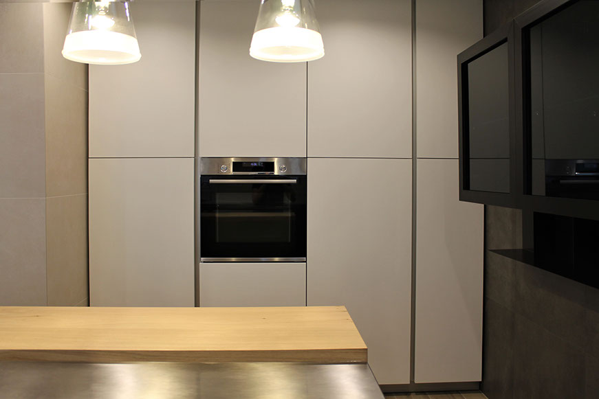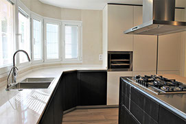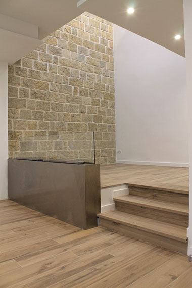 En la zona del comedor se ha desarrollado una pared en piedra natural de 6 metros de altura iluminada mediante un proyector led asimétrico. Para el pavimento se ha utilizado un material porcelánico simulando madera para dar calidez a la vivienda. En la cocina se han conjugado diferentes materiales tales como el acero inox, la madera de roble, o las vitrinas metálicas con cristal traslucido. La terraza se ha convertido en un espacio tranquilo, mediante la utilización de materiales cerámicos con tonos claros, balizas de luz empotradas y un amplio ventanal con gran proyección desde el interior de la vivienda. El aseo esta repleto de detalles tales como las hornacinas de acero o el mosaico de Appiani de formato 1'2x1'2 cms.